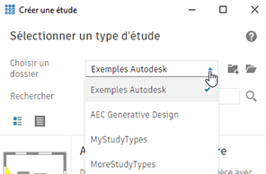 Pour créer une étude à l’aide de l’un des exemples Autodesk, sélectionnez Exemples Autodesk dans le champ Choisir un dossier dans la boîte de dialogue Créer une étude.