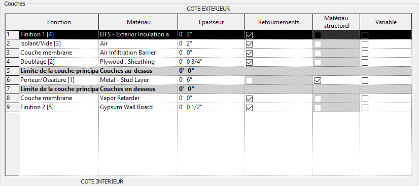 Utilisez la boîte de dialogue Modifier l'assemblage pour définir les propriétés de chaque couche de mur. Les propriétés de chaque couche de mur sont les suivantes :