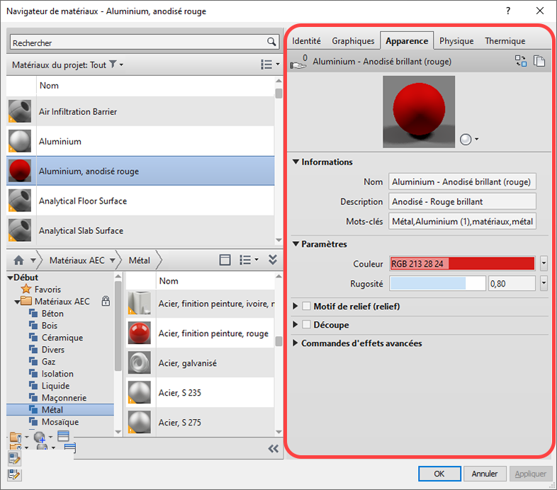 Dans le navigateur de matériaux, les informations s'affichent dans les onglets Identité, Graphismes et Apparence de l'Editeur de matériaux.
