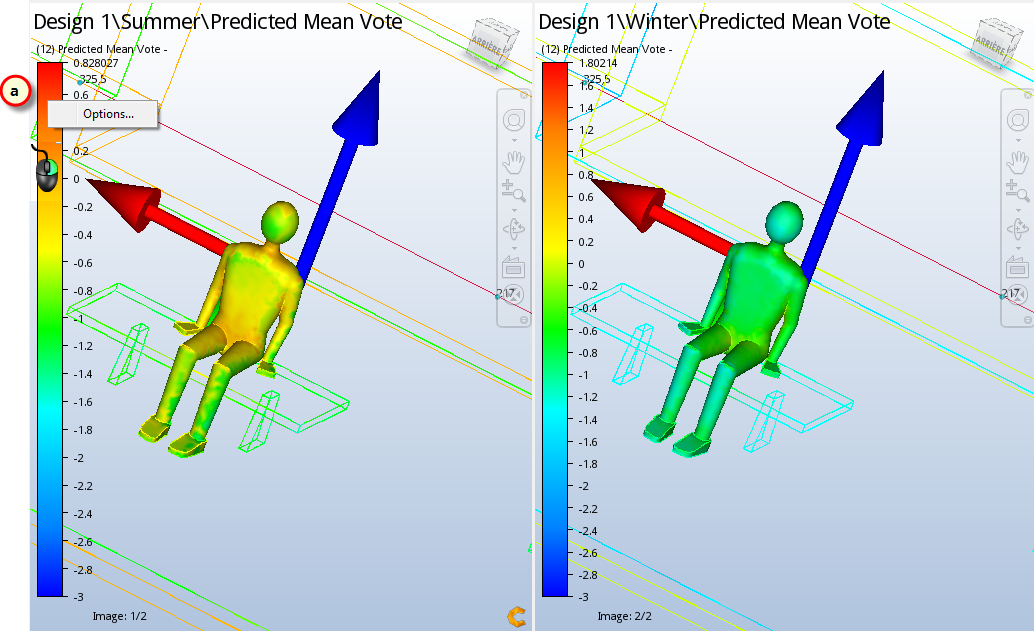 4. Effectuez un zoom avant et comparez les valeurs PMV sur la face avant de l'occupant.