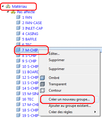 Dans la barre Etude de conception, développez la branche Matériau *. Cliquez avec le bouton droit sur les composants intitulés *Puce M et sélectionnez Créer un nouveau groupe.