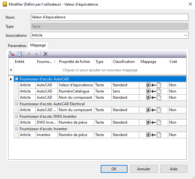 Une fois que vous avez configuré la propriété de numéro d'ID AutoCAD Mechanical et la propriété PSEQUIVALENCE, vous pouvez mapper les valeurs d'équivalence avec les propriétés Vault.