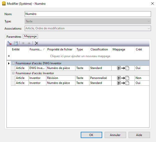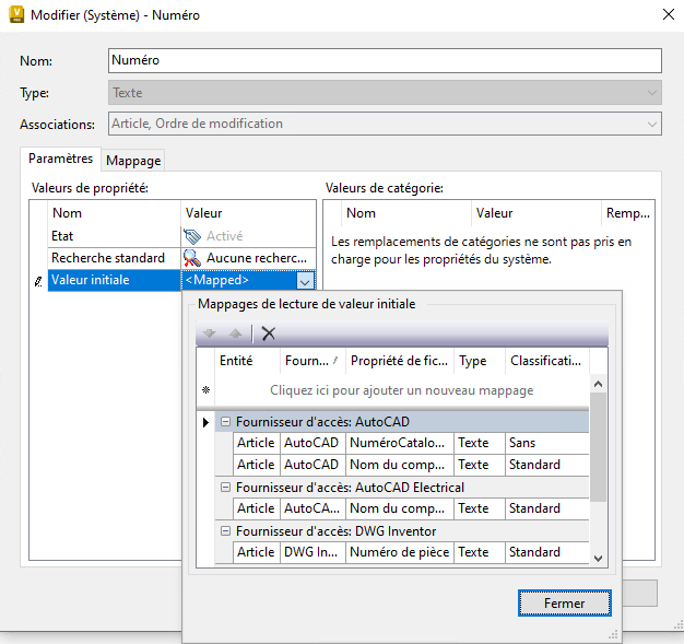 - Sélectionnez l'onglet Mappage pour l'intitulé Numéro et mappez de nouveau la propriété Numéro (d'article) dans AutoCAD Mechanical, comme indiqué.