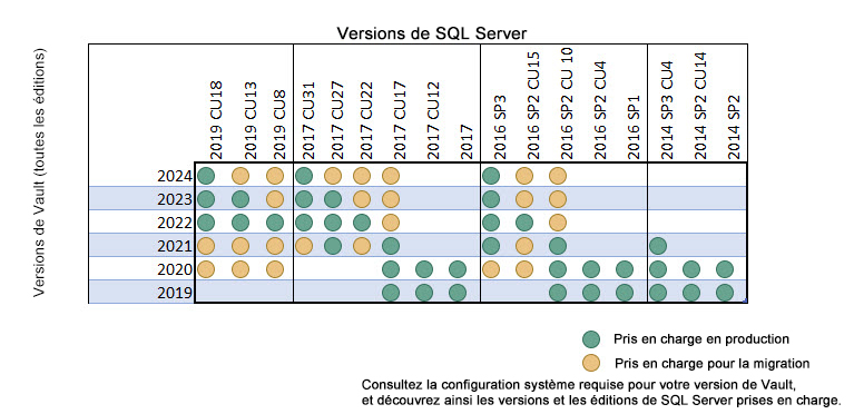 Le tableau ci-dessous indique la compatibilité des versions de Vault et de SQL à l'aide de points verts. Les points jaunes indiquent le chemin recommandé pour la mise à niveau. Reportez-vous à la configuration système requise pour votre version de Vault afin de vérifier la compatibilité entre les produits Vault et SQL.