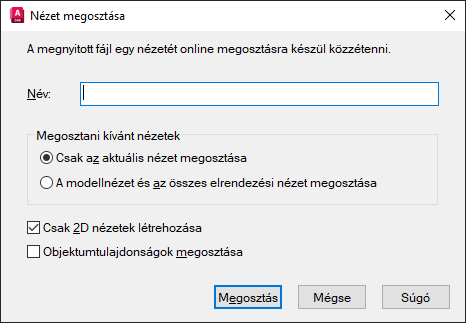 Elnevezi a megosztott nézetet. A név maximálisan 255 karakter hosszúságú lehet, és betűket, számokat, szóközöket és bármilyen speciális karaktert tartalmazhat, aamelyet az operációs rendszer és a program nem használ más célokra.