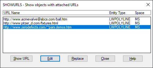 A Showurls párbeszédpanel megnyitásához adja ki a SHOWURLS parancsot. Egy URL-címet a címre kattintva jeleníthet meg, illetve egy vagy több URL-címre kattintva szerkesztheti vagy lecserélheti azokat.