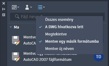 Esemény: Bontsa ki az esemény szűrőt, és válasszon az aktuális rajzhoz megjelenített eseménytípusok listájából.