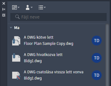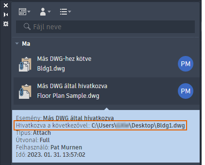 A Tevékenységbetekintő eseményei között megtalálható továbbá az is, amikor egy rajzot Xrefként csatolnak egy másik rajzhoz. Az aktuális rajzra hivatkozó rajz nevét az esemény részletei tartalmazzák.