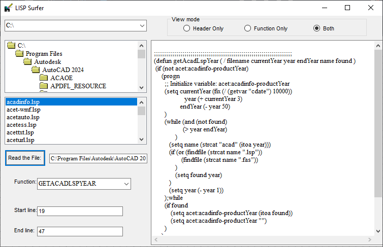Megjeleníti egy AutoLISP-fájl tartalmát egyéni függvények szerint.