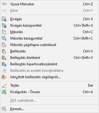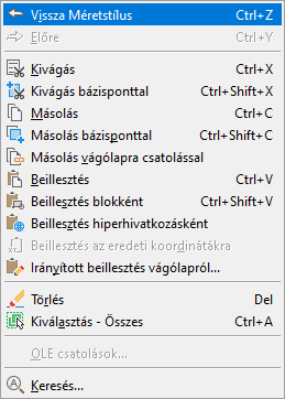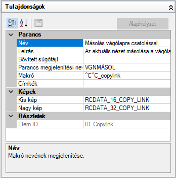 A hullámvonal (~) és a felkiáltójelet követő pont (!.) karakterek a Másolás vágólapra csatolással parancs címkéje elé kerülnek a Tulajdonságok ablaktábla Név tulajdonságában. Az alábbiakban látható a Szerkesztés menüben megjelölt és kiszürkített Másolás vágólapra csatolással parancs eredménye.