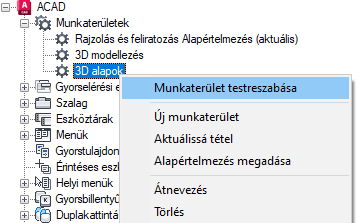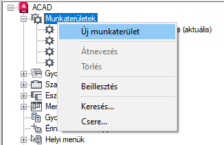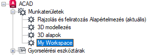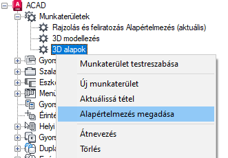 A CUIx-fájlban lévő munkaterületek egyike megjelölhető alapértelmezettként. Ha egy munkaterületet alapértelmezettnek állít be, akkor az lesz visszaállítva, amikor a CUIx-fájl az első alkalommal töltődik be a programba, illetve akkor, amikor a program a CUIx-fájlt a CUIBETÖLT parancs segítségével betölti.
