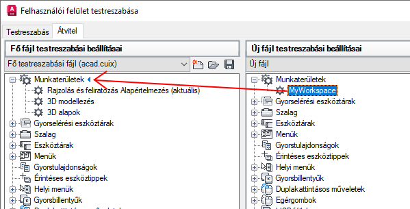 4. A <fájlnév> testreszabási beállításai területről (a jobb oldalon) húzza át a munkaterületet a CUIx-fájlból a fő CUIx-fájl (bal oldali) <fájlnév> testreszabási beállításai területének Munkaterületek csomópontjára.