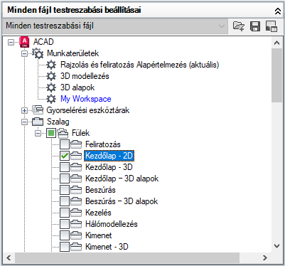 Megjegyzés: Most jelölőnégyzetek jelennek meg a Gyorselérés eszköztár, a szalaglapok, az eszköztárak, a legördülő menük, a részleges CUIx-fájlok csomópontjai mellett, így azok könnyen felvehetők a munkaterületre.