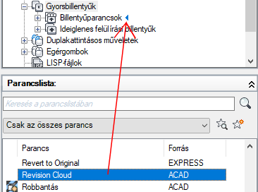 Billentyűparancs létrehozásához a Parancslista területről húzzon át egy parancsot a <fájlnév> testreszabási beállításai terület Billentyűparancsok csomópontjába.