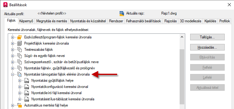• Nyomtatásistílus-táblázat (CTB-/STB-) fájlok. A nyomtatás során szabályozza a rajz színeit, vonaltípusait, vonalvastagságait és egyéb beállításait. A program kétféle típusú nyomtatási stílust támogat: a színfüggő (CTB) és az elnevezett (STB) nyomtatási stílust. Az előző kiadásból származó CTB- és STB-fájlokat a rendszer a Nyomtatásistílus-fájlok keresési útvonala beállításban megadott helyre telepíti át.