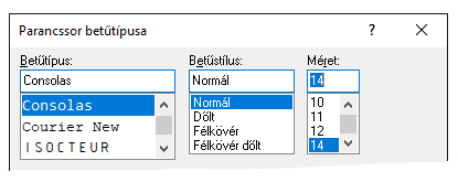 A Parancssor betűtípusa párbeszédpanelen módosíthatja a parancs- és szövegablakokban megjelenő szöveg betűtípusát, betűstílusát és méretét.