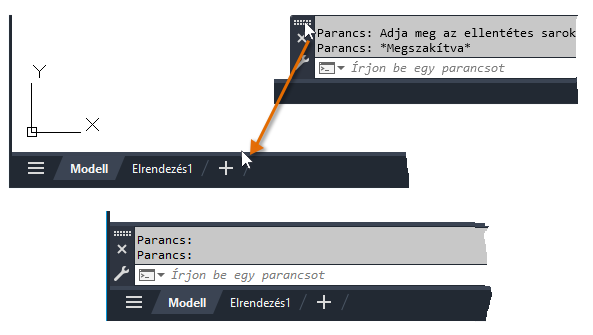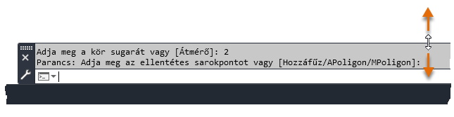 A parancsablak rögzítése – Kattintson a parancsablak bal oldalán lévő fogóra, és a gombot nyomva tartva húzza az ablakot az új helyére a rajzablak alsó vagy felső szélén. Amikor a parancsablak a kívánt helyen van, engedje el a gombot.