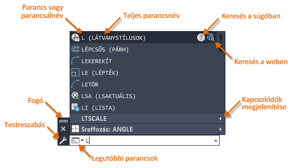 A parancsokat indíthatja a felhasználói felület valamelyik eleméről, például a szalagról vagy egy eszköztárról, vagy beírhatja közvetlenül a parancspromptba is. A parancsok közvetlenül a parancspromptban való megadása hatékonyabb lehet, mintha a szalagról vagy egy eszköztárról indítaná őket. Még azok számára is, akik az AutoCAD-et nap mint nap használják, könnyű átsiklani a parancsablakban elérhető egyes termelékenységi szolgáltatások felett.