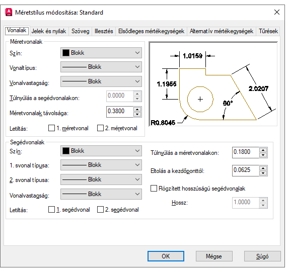 A méretstílusok segítségével vázlatolási szabványokat adhat meg és alkalmazhat. A MÉRETSTÍLUS paranccsal számos méretezési rendszerváltozót megadhat, így lényegében a méret megjelenésének és viselkedésének minden elemét vezérelheti. Minden méretstílusban mentve lesznek ezek a beállítások.