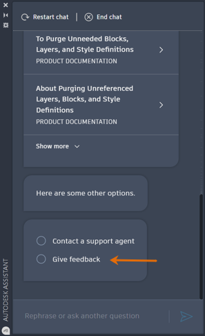If the suggested resources offered by Autodesk Assistant don't answer your question, select Contact a Support Agent.