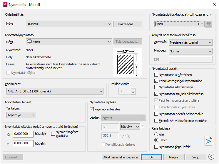 Rajzi elrendezés küldése egy nyomtatónak, egy plotternek vagy egy fájlba. A nyomtató beállításainak mentése és visszaállítása az összes elrendezéshez.