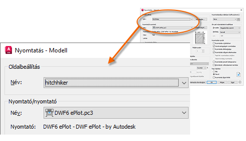 Ha készen áll a nyomtatásra, egyszerűen adja meg az oldalbeállítás nevét a Nyomtatás párbeszédpanelen, amellyel visszaállítja az összes nyomtatási beállítást. A következő illusztráción a Nyomtatás párbeszédpanelen az Útikalauz stopposoknak oldalbeállítás használata van beállítva, amely egy DWF- (Design Web Format-) fájlt fog létrehozni a nyomtatás helyett.
