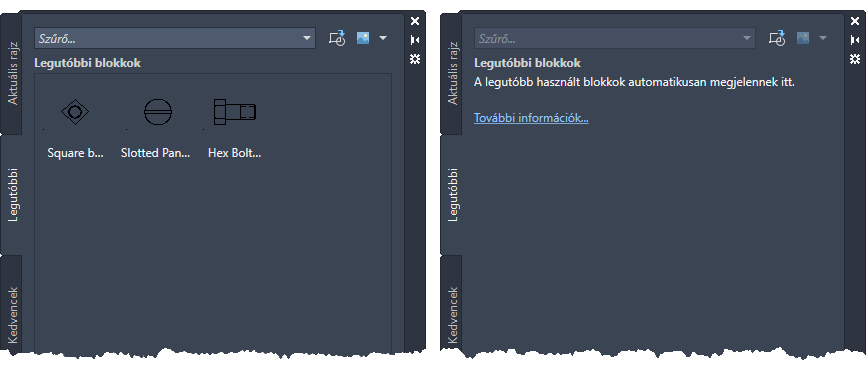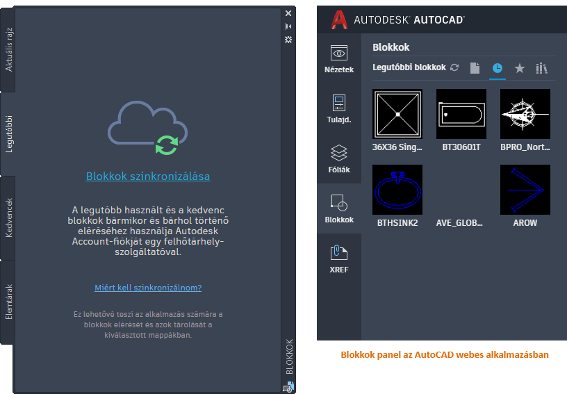 A Blokkok paletta Legutóbbi lapja a nemrégiben beszúrt vagy az aktuális rajzban létrehozott blokkok pillanatképeit jeleníti meg. Szinkronizálhatja a rajzban lévő legutóbbi blokkokat egy felhőtárhelyre, és bármilyen eszközről elérheti azokat az AutoCAD asztali alkalmazással vagy az