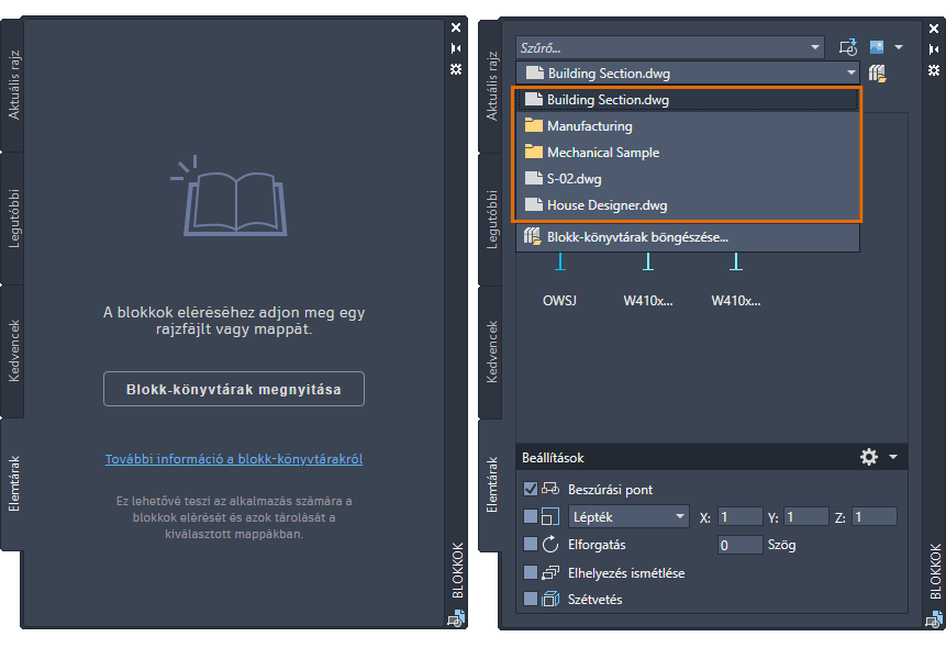 A Blokkok paletta Más rajz lapja át lett nevezve Elemtárak lapra. Mostantól megadhat egy mappát, egy rajzfájlt vagy egy rajzban tárolt blokkdefiníciót, és blokként beszúrhatja azt az aktuális rajzba. A Könyvtárak lap tartalmaz egy legördülő listát, amely a gyorsabb elérés érdekében megjeleníti az 5 legutóbb használt blokk-könyvtárat (mappát vagy rajzfájlt). Ha felhőalapú tárhelyen található blokk-könyvtárat választ ki, az AutoCAD webes alkalmazásban is használhatja ugyanazokat a blokkokat.