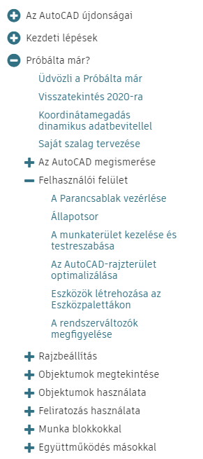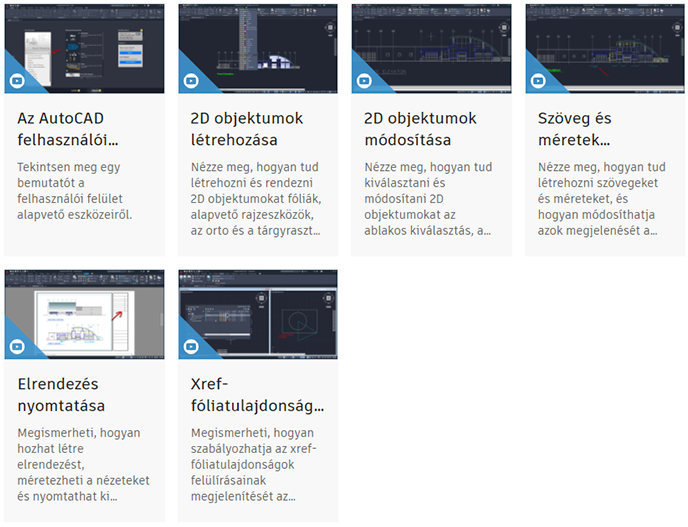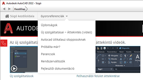 Az AutoCAD Súgó rendelkezik egy új Gyorsreferenciák menüvel, a „Próbálta már?” cikkek tehát mostantól tartalomjegyzékből érhetők el, az új kártyás formátum pedig egyszerűbb hozzáférést biztosít az oktatóvideókhoz.