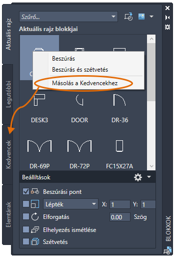 A Blokkok paletta mostantól lehetővé teszi a gyakran használt blokkok másolását az új Kedvencek lapra. A Blokkok paletta bármely lapjáról a Kedvencek lapra másolhat blokkokat.