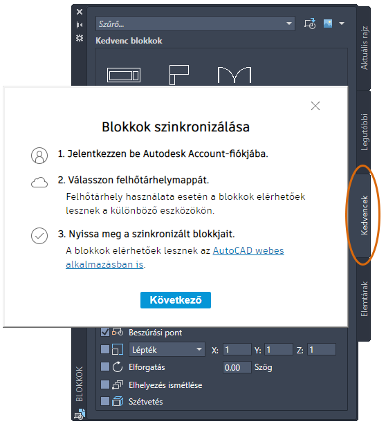 Ebben a frissítésben, ha az Autodesk Account-fiókot használja, és szinkronizálja a blokkokat egy felhőtárhely-szolgáltatóval, a