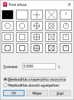 Beállítja a pont megjelenítési méretét. Az értékek lehetnek a képernyőhöz viszonyítottak vagy abszolút egységekben megadottak is. A pont megjelenítési méretét a PDSIZE rendszerváltozó tárolja. Az ezután megrajzolt objektumok az új értéket használják.