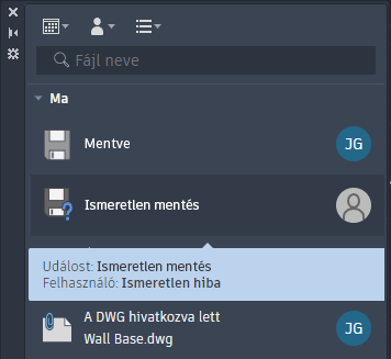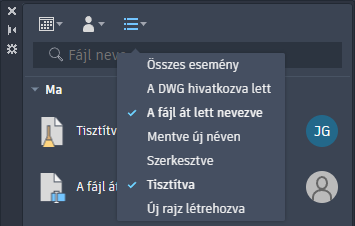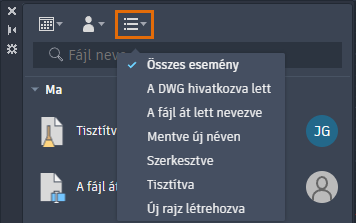 A Felhasználószűrő menü csak azokat a felhasználókat tartalmazza, akik az aktuális rajzon eseményeket eredményező műveleteket hajtottak végre.
