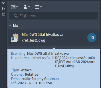 Amikor egy rajzhoz DWG-referenciát (xrefet) csatol, a program ezt eseményként rögzíti ahhoz a rajzhoz, amelyhez az xref csatolva lett, és az xrefként használt forrásrajzot is megjegyzi. Ez nagyon hasznosnak tud bizonyulni a rajzreferenciák kezelése során.