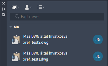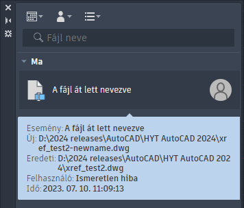 Ebben a szakaszban a Fájlkezelőben átnevezzük az xref_test2.dwg fájlt, és megnézzük, hogy milyen típusú esemény jelenik meg a Tevékenységbetekintő palettán.