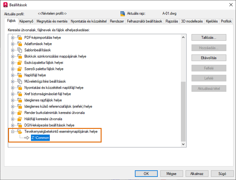 Fontos: Az AutoCAD LT jelenleg nem támogatja a Tevékenységbetekintő adatainak megtekintését, de a rajzesemények naplózását igen. Ahhoz, hogy a rendszer az összes rajzeseményt rögzítse, az AutoCAD LT-t használó együttműködőknek az ACTIVITYINSIGHTSPATH rendszerváltozót ugyanarra a megosztott helyre kell beállítaniuk a parancssorban.