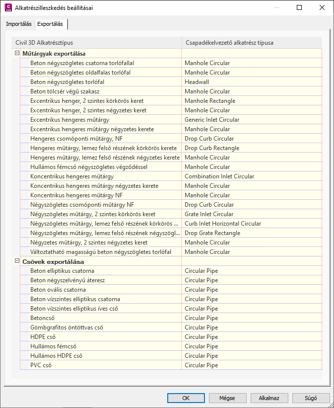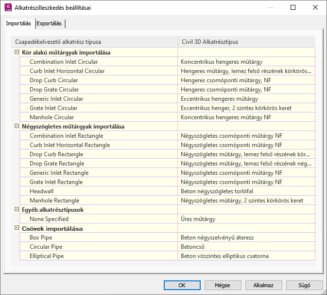 Az alapértelmezett alkatrész-egyeztetés korlátozva van, amikor adatokat importál és exportál a Storm Sewers kiegészítésből az Autodesk Civil 3D programba, majd vissza a Storm Sewers kiegészítésbe.