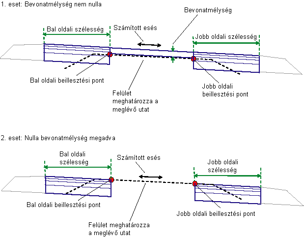 Megállapításra kerül a Bal és Jobb beillesztési pont magassága a meglévő felületen, majd a program kiszámítja a két pont közötti lejtést. Ha nem nulla Bevonatmélység van megadva, akkor egy bevonati réteg kerül hozzáadásra a meglévő sávhoz a kiszámított eséssel. Egy zárt átfedő alakzat jön létre azáltal, hogy egy vagy több kapcsolódás rávetül a meglévő szintre. A kiszélesedő sávok kifelé kerülnek beillesztésre az átfedési élektől a megadott szélességig a kiszámított lejtéssel.
