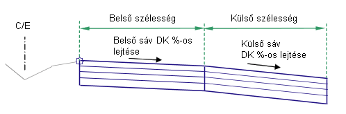 Ez az alkotóelem létrehoz belső és külső sávokat, amelyek különböző lejtéssel rendelkezhetnek. A belső sávok a csatolási ponttól kifelé kerülnek beillesztésre, a Belső sáv túlemelési lejtéssel. Ha a túlemelés nincs meghatározva egy szelvénynél, a Belső alapértelmezett % lejtés értéke kerül felhasználásra. A külső sávok kifelé kerülnek beillesztésre a belső sávok végétől, a külső sáv túlemelése vagy a Külső alapértelmezett % lejtés használatával.