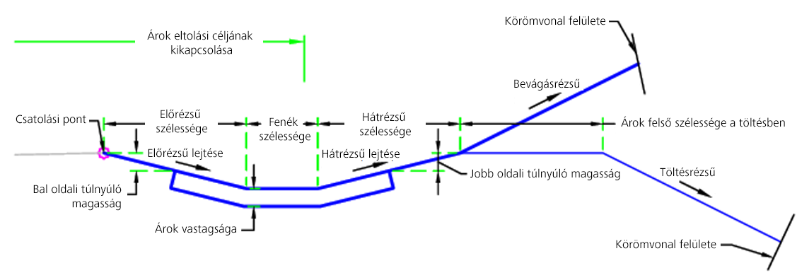 | Árok kihagyása | Ezzel kikapcsolható az árok létrehozása. A következő objektumtípusokat lehet megadni az eltolás céljaként: nyomvonalak, vonalláncok, vezérlővonalak és földmérési alakzatok. | Választható |