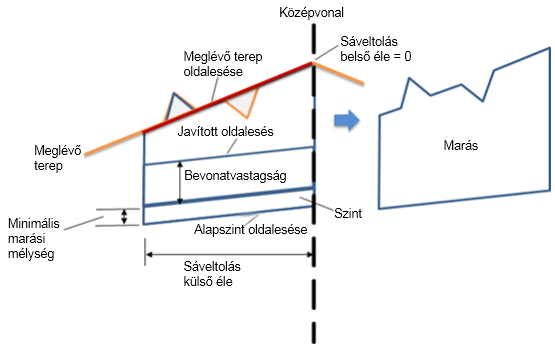 | Meglévő sáv külső élének eltolási célja | A külső mintapont eltolását meghatározó objektum neve, amely segítségével a program kiszámolja a meglévő felület lejtését. A következő objektumtípusokat lehet megadni az eltolás céljaként: nyomvonalak, vonalláncok, vezérlővonalak és földmérési alakzatok. | Nem |