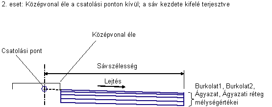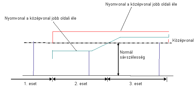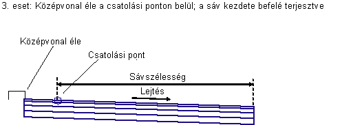 A forgalmi sáv belső élének helye az előző ábrán látható három eset alapján kerül kiszámításra. Ha nincs megadva a Középvonal éle nyomvonal, vagy a megadott érték nem található meg egy szelvénynél, akkor a belső él a csatolási pontnál marad (1. eset). Ha a Középvonal éle nyomvonal meg van adva, és a nyomvonal kívül van a sáv csatolási pontján, akkor a belső éle kifelé mozdul el a csatolási ponttól a sáv lejtésével (2. eset). Ha a Középvonal éle nyomvonal belül van a sáv csatolási pontján, akkor a belső éle kifelé mozdul el a csatolási ponttól a sáv lejtésénél (3. eset).