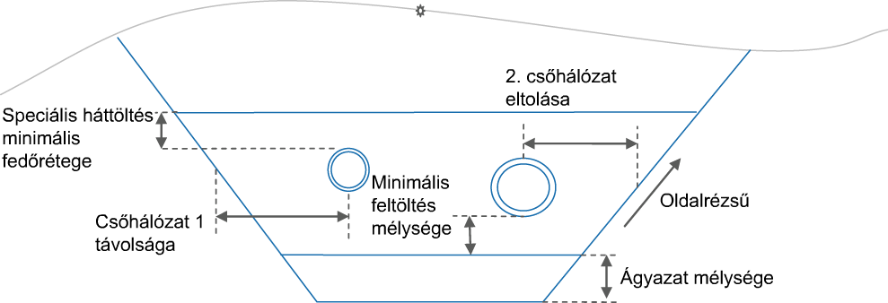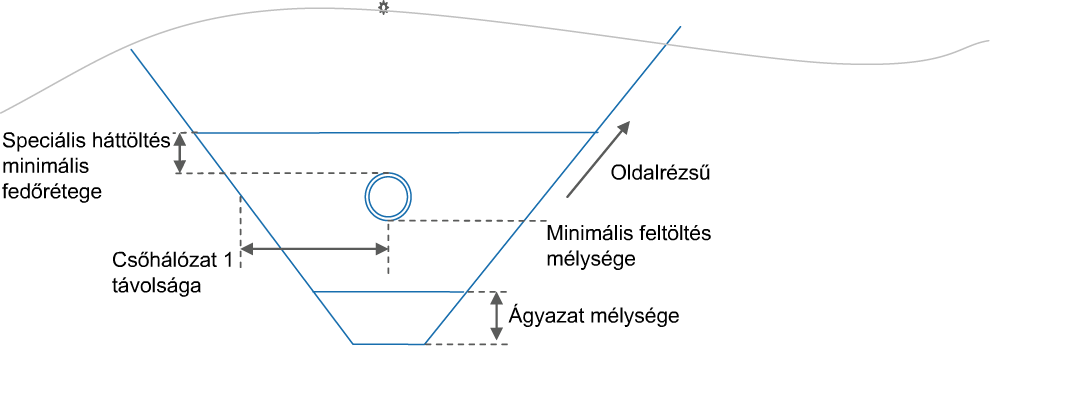 Két kiválasztott csőhálózat esetén alapértelmezés szerint a Csőhálózat 1 van a kiindulási vonal bal oldalán. A Csőhálózat 2 alapértelmezés szerint a nyomvonal jobb oldalán van. A Speciális háttöltés minimális mélységének anyagmélységét a magasabb külső átmérővel rendelkező cső és a Speciális háttöltés minimális fedőrétegének mélysége határozza meg. Az árok aljának mélységét az alacsonyabb külső átmérővel rendelkező cső, a Speciális háttöltés minimális mélysége és az ágyazat mélysége határozza meg.