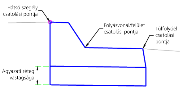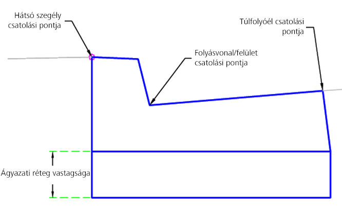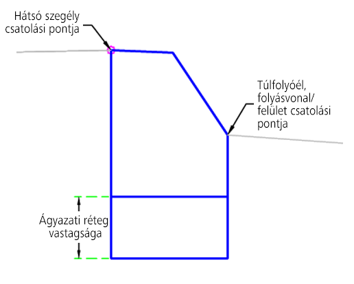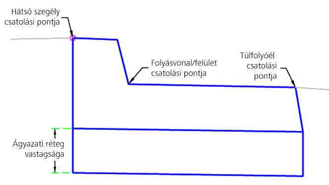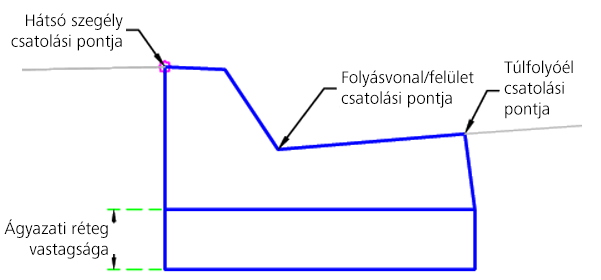 A szegély- és vízlevezető-kapcsolódásokat az alkotóelemben tárolt értékek alapján illeszti be a program. Minden méret pozitív, és nem nulla. Ha nem nulla az ágyazati réteg megadott vastagsága, akkor az ágyazati réteget nem illeszt be a program. Az ágyazati réteg lezárja a szegély hátának alját.