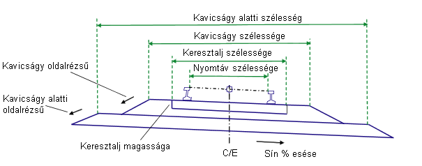 A sín, keresztalj, kavicságy és alkavicságy kapcsolódásai a megadott beviteli paraméterek alapján kerülnek kiszámításra és elhelyezésre. Ha a Sín % lejtés nem nulla, akkor a nyomterv hossz-szelvény magassága a sín közepén marad az alacsony oldalon. A pályafelület, keresztalj, kavicságy és az alkavicságy megőrzi a %-os lejtést.