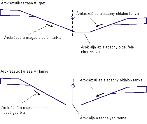 A túlemelés vagy a kanyarodósáv következtében az árok rézsűk teteje különböző szintmagasságon lehet a bal és a jobb oldalon, aszimmetrikus árkot eredményezve. Kétféleképpen lehet kezelni ezt a helyzetet. Ha az Árok rézsűk tartása alatt az Igaz érték szerepel, akkor a megadott árok rézsű állandó marad mindkét oldalon, és az árok alja elmozdul a tengelyvonaltól az alsó oldal felé. Ha Hamisra van állítva, akkor az árok alja középső tengelyvonalhoz lesz középre igazítva, a megadott lejtés megmarad az alsó oldalon, és az esés hozzá igazodik a felső oldal eséséhez.