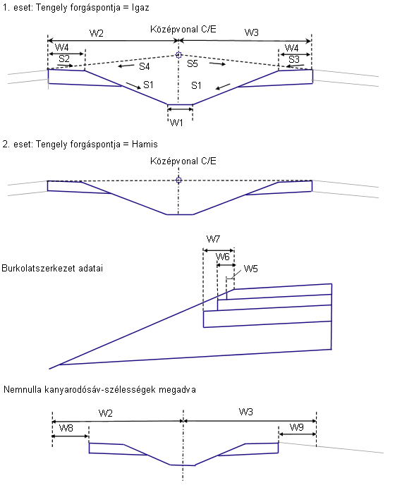 Válassza ki, hogy a hossz-szelvény esés és a forgáspont a tengelyvonalon legyen a középvonali árok felett, vagy a forgalmi sávok belső éleinél maradjon |