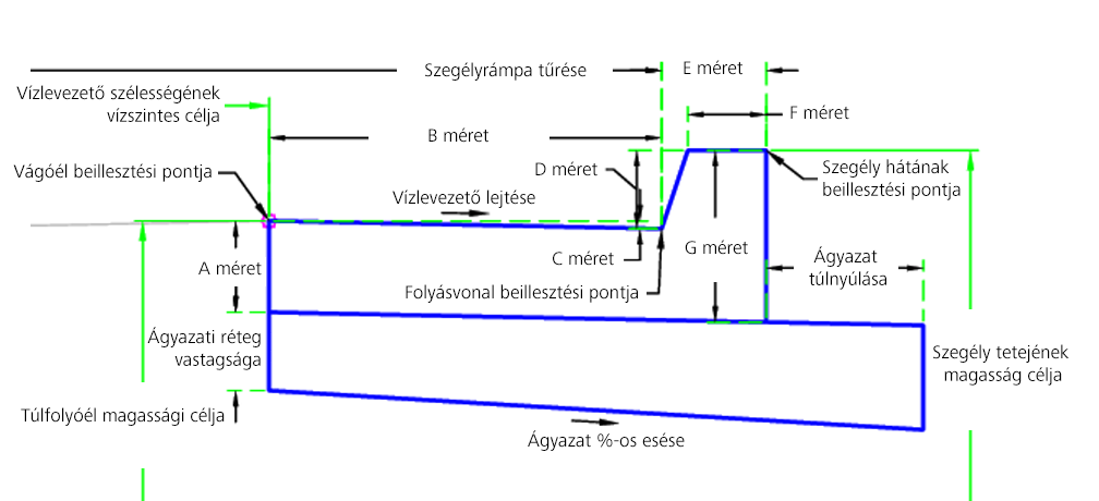 | A szegély tetejének célja | Ezzel felülbírálható a szegély tetejének szintmagassága, és a szegély tetejének szintmagassága egy hossz-szelvény szintmagasságához köthető. A szintmagasság megadása a következő objektumtípusok esetében lehetséges: hossz-szelvények, 3D vonalláncok, vezérlővonalak és földmérési alakzatok. | Választható |