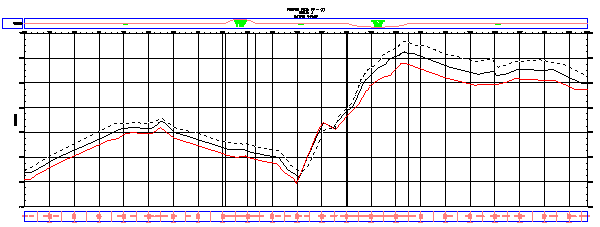 Figyelje meg, hogy a szerkesztőfogók megjelennek a hossz-szelvény mentén. Ha egy kicsit eltávolítja a nézetet, láthatja, hogy ugyanez a hossz-szelvény a másik hossz-szelvény nézetben is ki van jelölve. Ha a fogókkal módosítja a hossz-szelvényt az egyik hossz-szelvény nézetben, ugyanezek a módosítások végbemennek a hossz-szelvény másik példányában is.