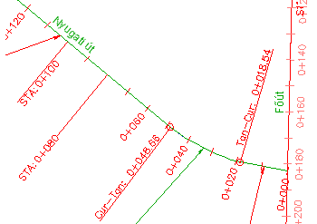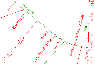 Figyelje meg, hogy a rajzban a STA:0+080 és STA:0+100 feliratszövegek különböző méretűek, és a szöveg és vonal máshogy illeszkedik. A gyermek stílus megosztja az alaptulajdonságait azzal a szülő stílussal, amelyből létre lett hozva. Ha egy tulajdonságérték megváltozik a szülő stílusban, a gyermek stílusban is módosul az adott tulajdonság értéke. Ha egy tulajdonságérték megváltozik a gyermek stílusban, a változás nincs hatással a szülő stílusra.